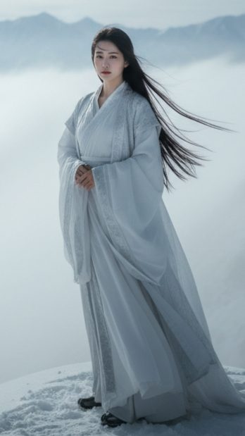 ภาพถ่ายจริงของหญิงสาวใบหน้าเดียวกับภาพอ้างอิง แต่งกายเป็นจอมยุทธ์หญิงในชุดจีนโบราณสีขาวเงิน ยืนบนยอดเขาหิมะที่มีหมอกหนาปกคลุม ผมปลิวเบาในลมเย็น แสงพระอาทิตย์เช้าส่องลอดหมอก ฉากหลังเป็นเทือกเขาและวิหารโบราณไกล ๆ --ar 9:16 --v 6 --style raw --q 2 --hd