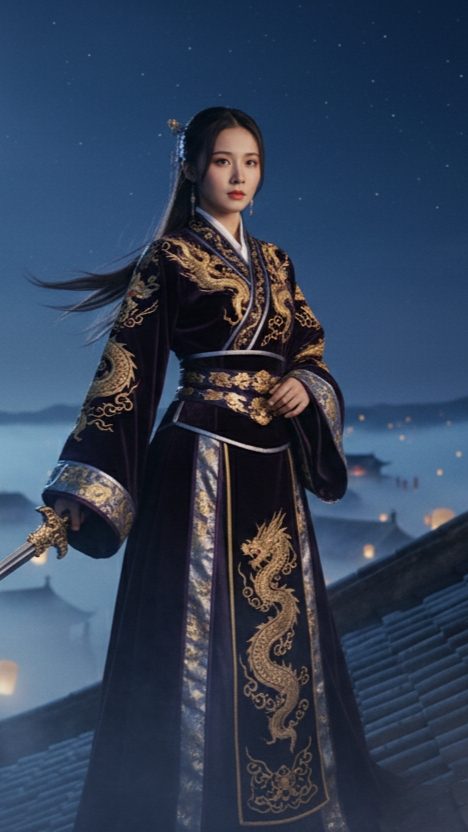 หญิงสาวใบหน้าอ้างอิงในชุดจีนกำมะหยี่สีดำ-ม่วงเข้ม มีลายมังกรทอง ยืนบนหลังคาเมืองโบราณใต้แสงจันทร์ แสงจันทร์สะท้อนใบมีดในมือ เงาหลังพริ้วในหมอก ฉากหลังมีโคมไฟลอยและท้องฟ้าสีครามเข้ม --ar 9:16 --v 6 --style raw --q 2 --hd