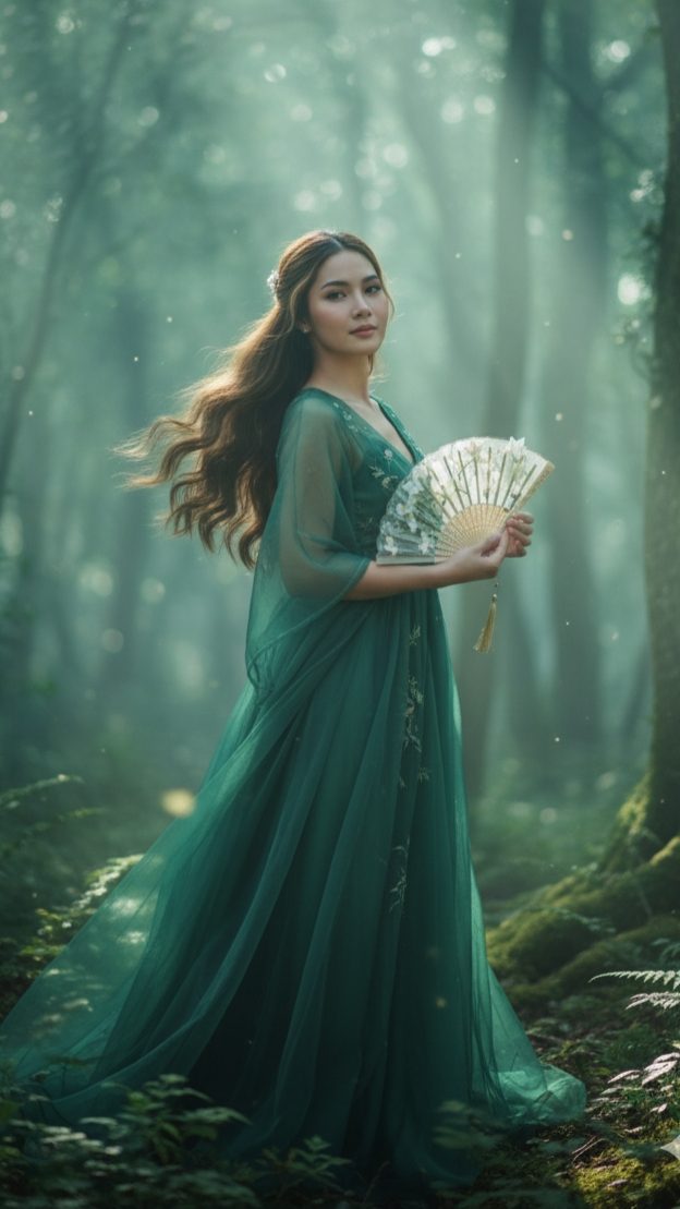 หญิงสาวใบหน้าอ้างอิงในชุดผ้าไหมสีเขียวมรกตโปร่งบาง ยืนอยู่กลางป่าหมอกเขียว มีแสงแดดลอดผ่านยอดไม้ ผมยาวพลิ้วเหมือนลอยตามสายลม มือถือพัดกลีบดอกไม้สีขาว --ar 9:16 --v 6 --style raw --q 2 --hd