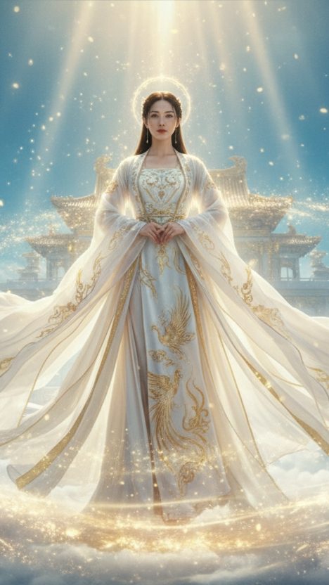 หญิงสาวใบหน้าอ้างอิงในชุดจีนโบราณสีขาวทอง ผ้าคลุมยาวโปร่งบางลอยเหนือพื้นราวกับลอยอยู่ในอากาศ ฉากหลังเป็นวังสวรรค์กลางเมฆ มีแสงทองและละอองพลังหมุนรอบตัว --ar 9:16 --v 6 --style raw --q 2 --hd