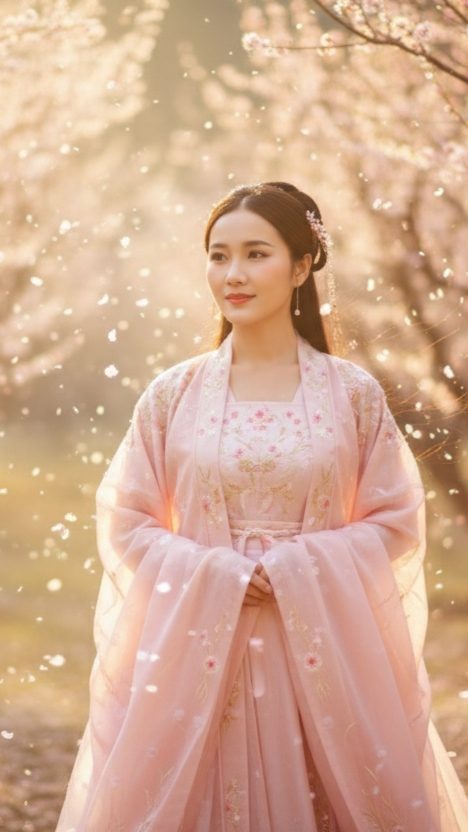 หญิงสาวใบหน้าอ้างอิงในชุดจีนโบราณสีชมพูอ่อนปักลายดอกเหมย ยืนท่ามกลางกลีบดอกเหมยที่ปลิวในอากาศ แสงอาทิตย์ยามเย็นส่องลอดต้นไม้ สร้างบรรยากาศอบอุ่นละมุน --ar 9:16 --v 6 --style raw --q 2 --hd