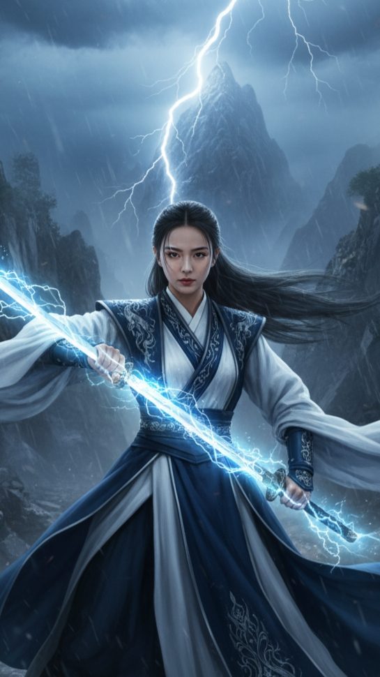 หญิงสาวใบหน้าอ้างอิงในชุดจีนโบราณสีน้ำเงิน-ขาว มือถือกระบี่ที่มีพลังสายฟ้าล้อมรอบ ฉากหลังเป็นท้องฟ้ามีฟ้าผ่ากลางหุบเขา ลมพัดแรง ผ้าคลุมปลิวสะบัด แสงสายฟ้าส่องใบหน้าเธอชัดเจน --ar 9:16 --v 6 --style raw --q 2 --hd