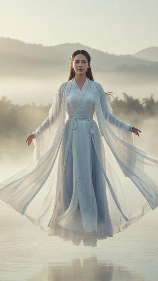 หญิงสาวใบหน้าอ้างอิงในชุดจีนสีขาวฟ้าละมุน ลอยอยู่เหนือผืนน้ำที่มีหมอกบางล้อมรอบ ผมและผ้าคลุมลอยตามลม ใบหน้าอ่อนโยนแต่สง่างาม แสงยามเช้าส่องผ่านหมอกบาง ๆ --ar 9:16 --v 6 --style raw --q 2 --hd
