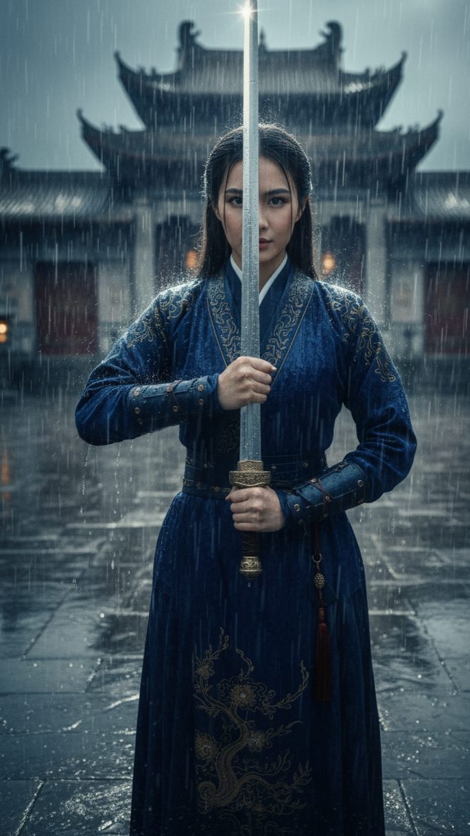 หญิงสาวใบหน้าอ้างอิงในชุดจีนโบราณสีน้ำเงินเข้ม มือถือดาบเคลือบหยดน้ำ ยืนกลางสายฝนโปรยในลานวัดเก่า แสงสะท้อนจากพื้นเปียกสร้างโทนภาพจริงจังและงดงาม --ar 9:16 --v 6 --style raw --q 2 --hd