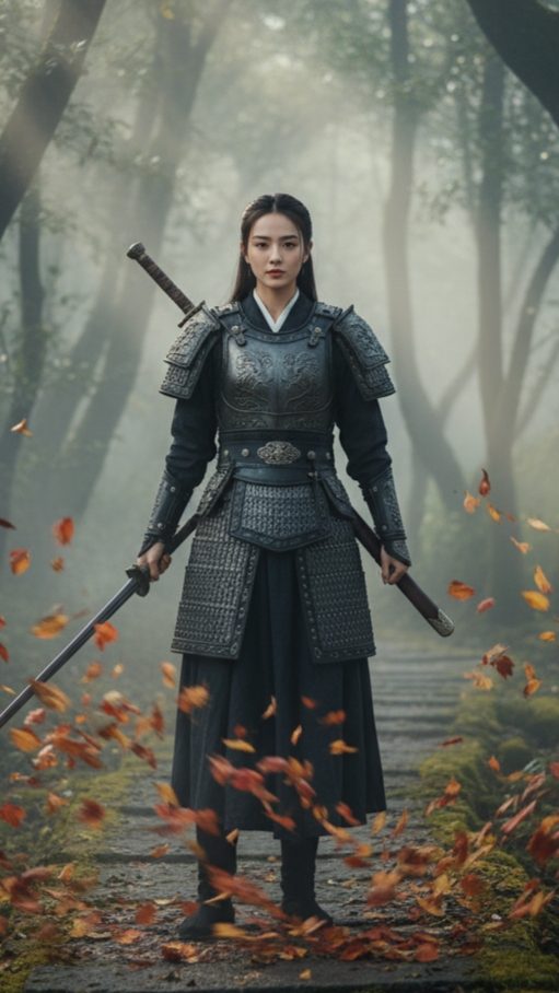 หญิงสาวใบหน้าอ้างอิงในชุดนักรบจีนโบราณสีเงินเข้ม มีเกราะเบาและดาบคาดหลัง ยืนบนทางหินกลางป่าภูเขา หมอกและใบไม้ปลิวรอบตัว สายตาเธอมุ่งมั่นสงบ --ar 9:16 --v 6 --style raw --q 2 --hd