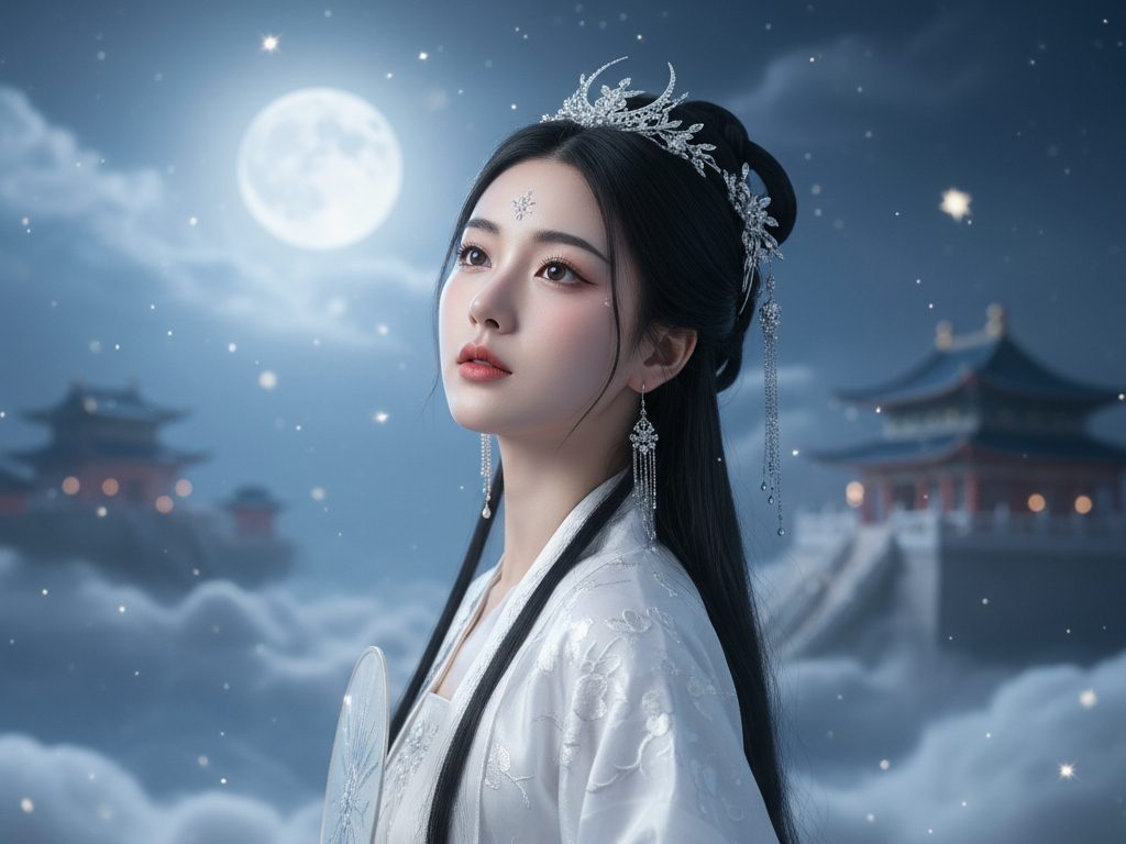 ฉาก/บรรยากาศ: วิหารสวรรค์ลอยบนเมฆยามค่ำ แสงจันทร์เต็มดวง โบเก้ดาวละเอียด หมอกบาง