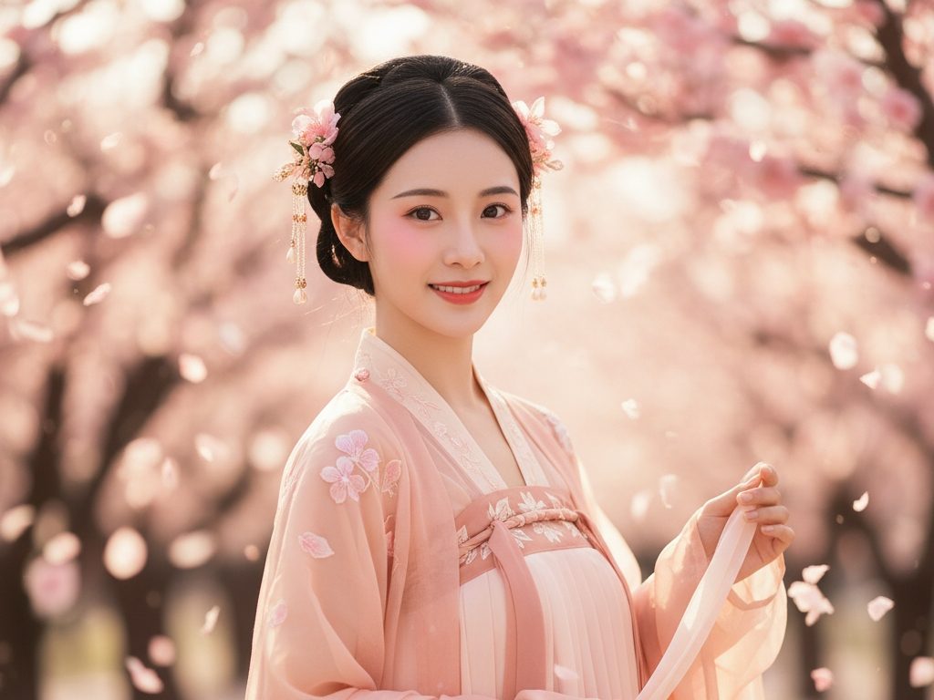 ชุด/พร็อพ: ฮั่นฟูชมพูพีชไล่เฉด ปักกลีบดอกละเอียด ชั้นนอกโปร่ง ถือริบบิ้นผ้าไหม