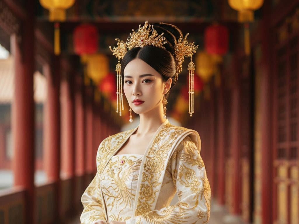 ชุด/พร็อพ: ฮั่นฟูครีมทอง ผ้าคลุมยาวปลิวตามลม