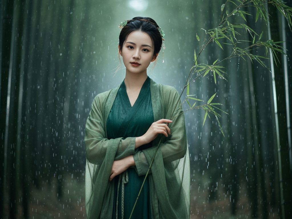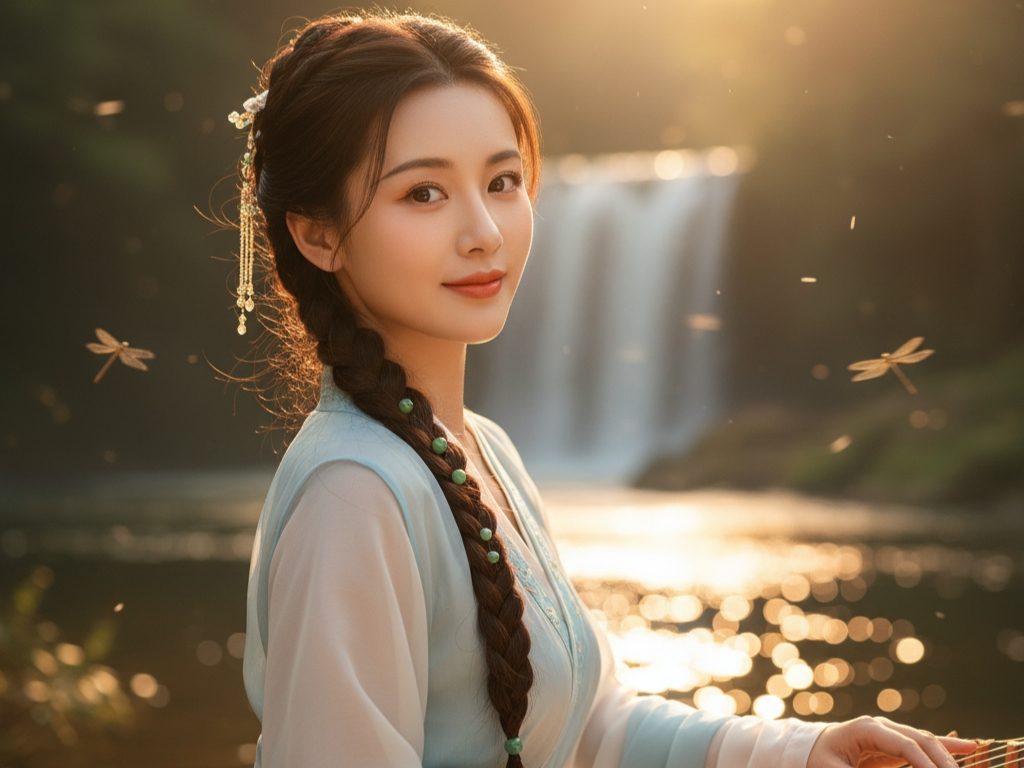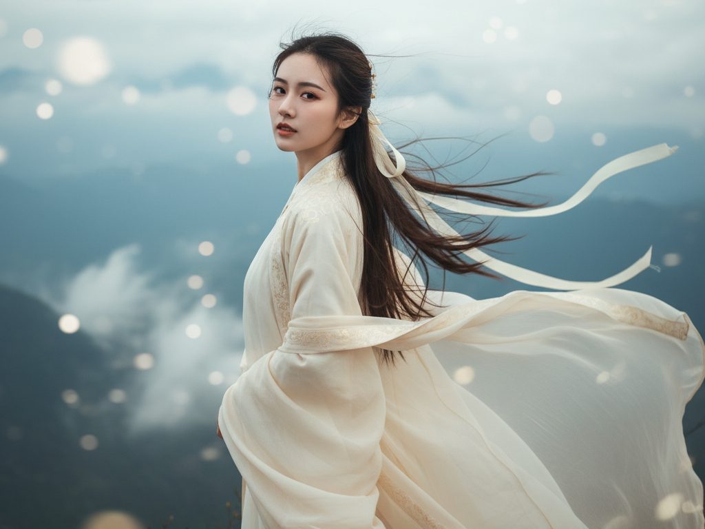 ชุด/พร็อพ: ฮั่นฟูฟ้าขาว เนื้อผ้าบางพริ้ว ถือพิณไม้ไผ่โผล่ในเฟรมเพียงเล็กน้อย