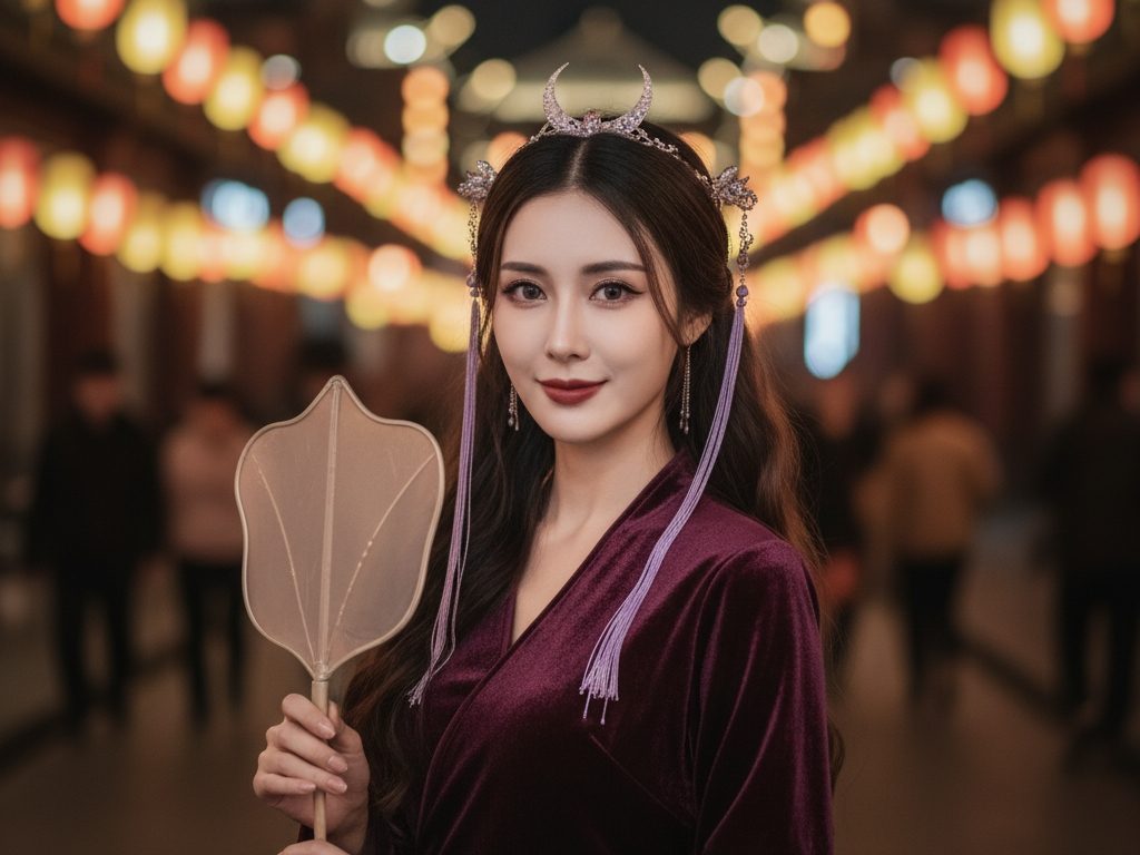ผม/เครื่องประดับ: คลื่นนุ่มยาว ประดับพู่ม่วง–เงิน และมงกุฎเสี้ยวดาว