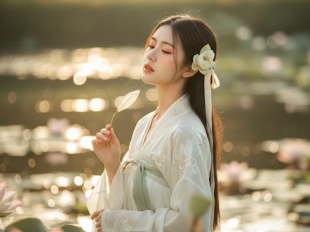 ชุด/พร็อพ: ฮั่นฟูขาว–เขียวอ่อน ปักเส้นเงินลายบัว ถือกลีบบัวบาง