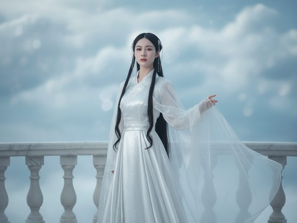 ชุด/พร็อพ: ฮั่นฟูขาว–เงิน ผ้าไหมออร์แกนซาพริ้ว ไล่เฉดเงินมุก ปักลายกลีบดอกจันทร์ ถือพัดโปร่งใส