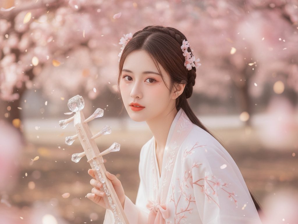 ชุด/พร็อพ: ฮั่นฟูขาว–ชมพูอ่อน ปักลายกิ่งกัลปพฤกษ์ ถือสายพิณคริสตัล