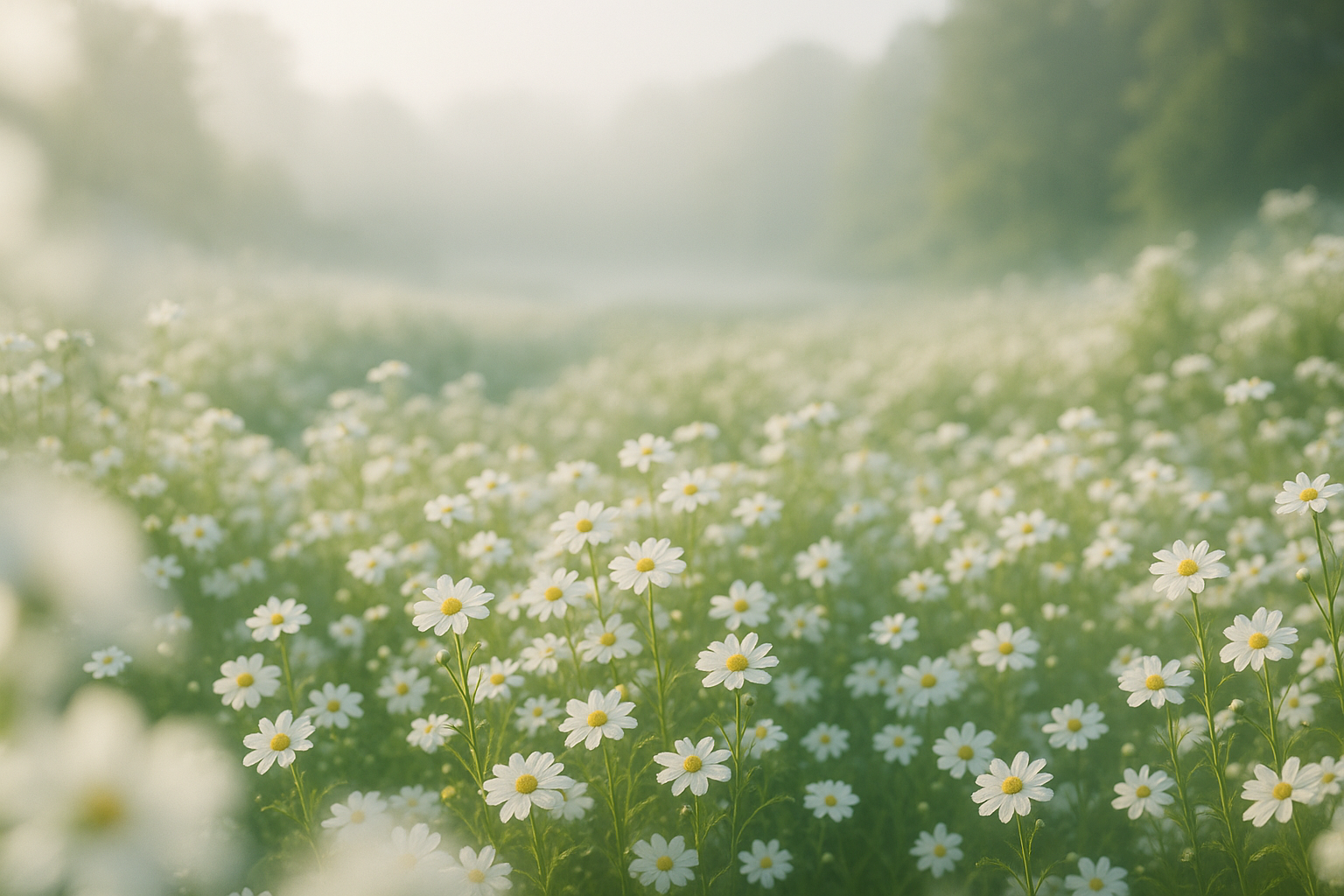 ภาพถ่ายจริงระดับ 8K ของสวนดอกไม้สีขาวบานสะพรั่งทั่วพื้นที่ กลีบดอกไม้เบลออยู่ด้านหน้าเป็นกรอบธรรมชาติ แสงเช้าแบบ high-key สดใส หมอกบางลอยเหนือพื้นหญ้า แสงอาทิตย์ส่องผ่านกลีบดอกอย่างนุ่มนวล โฟกัสคมบริเวณกลางสวน ฉากหลังละลายเป็นโบเก้อย่างเป็นธรรมชาติ ถ่ายด้วยเลนส์ 105mm f/1.8 --ar 16:9 --v 6 --style raw --q 2 --hd