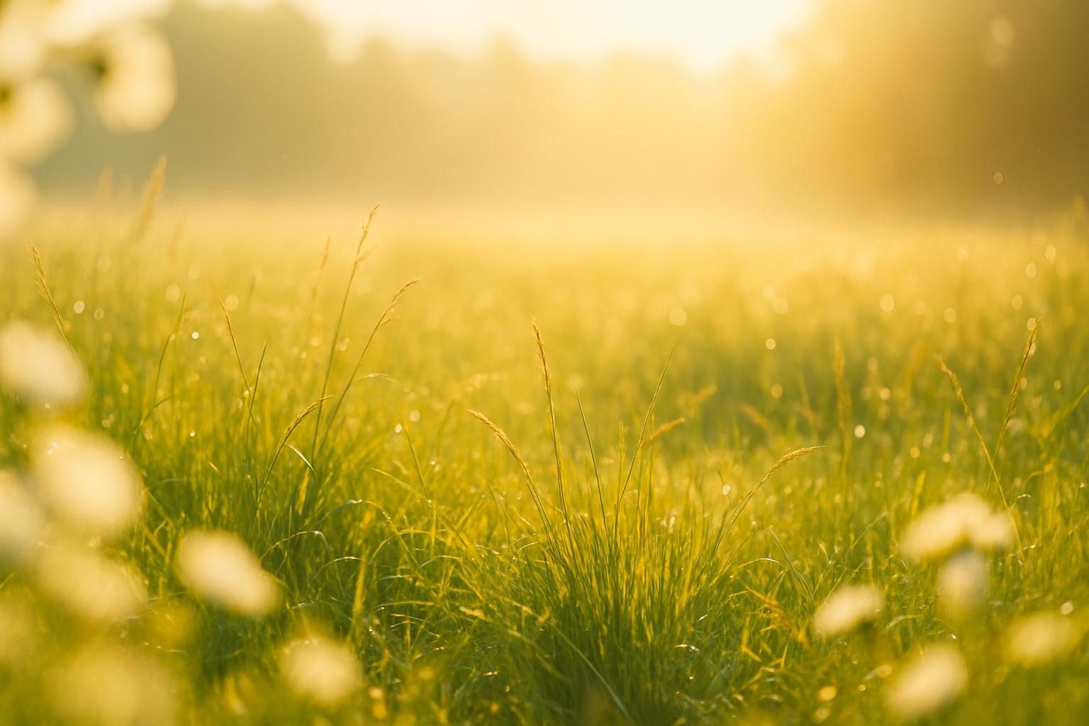 ทุ่งหญ้าสีทองและเขียวเปล่งประกายยามเช้า หยดน้ำค้างสะท้อนแสงอ่อน โฟกัสกลางทุ่ง กลีบดอกไม้เล็กเบลอด้านหน้าเป็นกรอบธรรมชาติ โทน high-key สดใส แสงอบอุ่นเหมือนถ่ายด้วยกล้องมืออาชีพ --ar 16:9 --v 6 --style raw --q 2 --hd