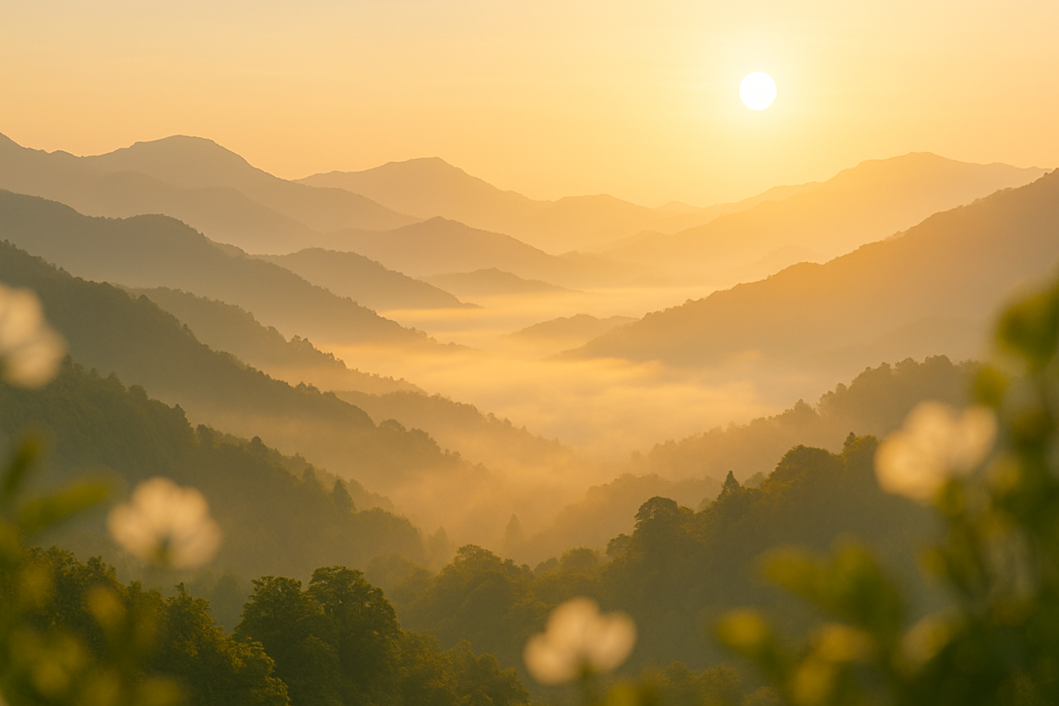 ภูเขาซ้อนชั้นมีทะเลหมอกลอยเหนือหุบเขา แสงพระอาทิตย์เช้า high-key อบอุ่น หมอกบางปกคลุมยอดไม้ กลีบดอกไม้เบลอด้านหน้าเป็นเฟรมธรรมชาติ โฟกัสกลางหุบเขา ฉากหลังละลายสวยงาม --ar 16:9 --v 6 --style raw --q 2 --hd