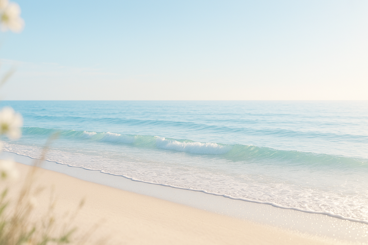 ชายหาดทรายขาวละเอียดกับคลื่นทะเลอ่อนโยนสะท้อนแสงอาทิตย์ยามเช้า โทนภาพ high-key สดใส ท้องฟ้าสีฟ้าอ่อนใส กลีบดอกไม้หรือหญ้าชายหาดเบลออยู่ด้านหน้าเป็นกรอบธรรมชาติ แสงกระทบผิวน้ำระยิบระยับ โฟกัสลึกที่แนวคลื่น --ar 16:9 --v 6 --style raw --q 2 --hd