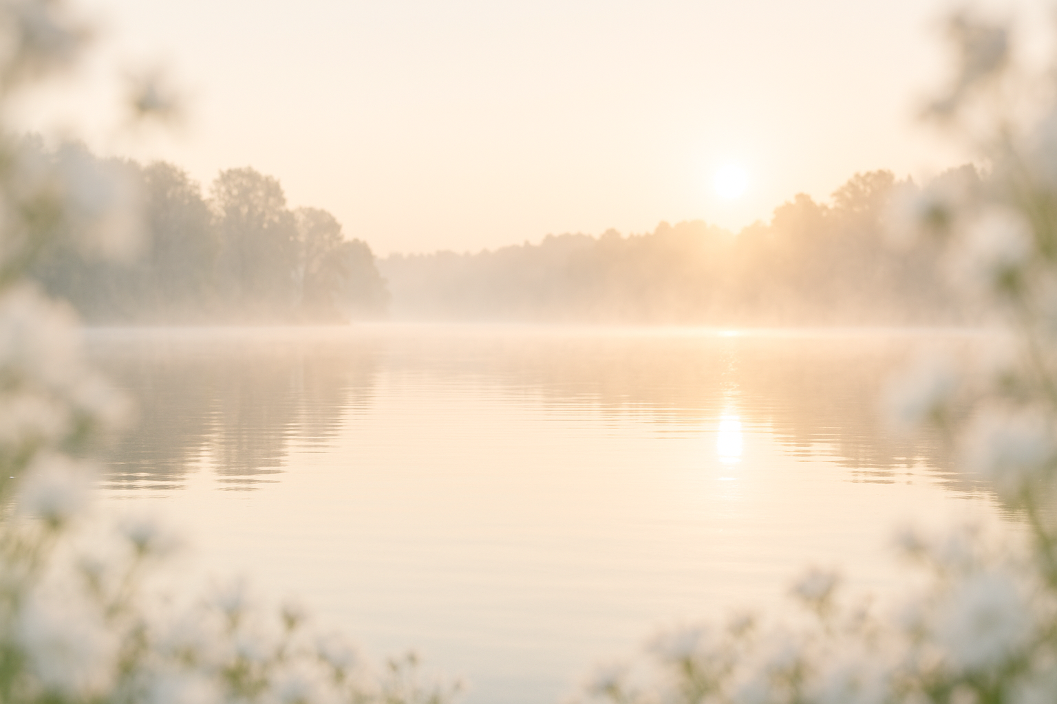 ทะเลสาบเงียบสงบสะท้อนแสงพระอาทิตย์ขึ้น หมอกบางปกคลุมผิวน้ำ โทนภาพ high-key สดใส กลีบดอกไม้สีขาวเบลออยู่ด้านหน้าเป็นกรอบธรรมชาติ ต้นไม้พื้นหลังละลายเบา ๆ ด้วยโบเก้ โฟกัสคมชัดกลางน้ำ --ar 16:9 --v 6 --style raw --q 2 --hd