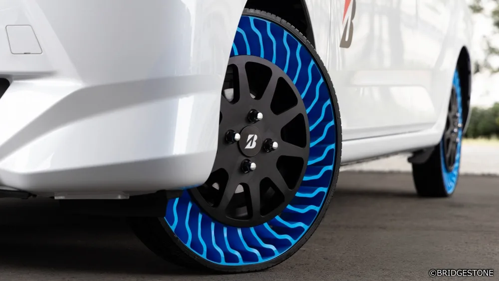 ยาง AirFree ถูกออกแบบมาเพื่อแก้ปัญหาเรื่องยางแบนได้อย่างมีประสิทธิภาพ ด้วยโครงสร้างซี่ล้อสีน้ำเงินที่ไม่ต้องใช้ลมยาง ทำให้ลดความกังวลเกี่ยวกับการรั่วซึม และยังถูกออกแบบมาให้มีโครงสร้างที่เรียบง่ายสำหรับการหล่อดอกยางใหม่และการรีไซเคิลที่ง่ายดาย วัสดุที่ใช้สามารถนำกลับมาใช้ใหม่ได้ทั้งหมด ดังที่ปรากฏภาพเม็ดพลาสติกสีน้ำเงินในภาชนะใส ซึ่งเป็นส่วนประกอบสำคัญของยางชนิดนี้ นวัตกรรมนี้ได้รับการเผยแพร่ภายใต้แฮชแท็ก #InnovationJapan แสดงถึงความมุ่งมั่นของญี่ปุ่นในการพัฒนานวัตกรรมยานยนต์.