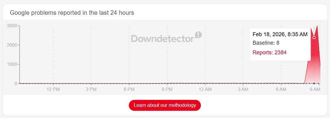 หลังจากเกิดเหตุขัดข้องกับ YouTube ล่าสุดพบว่า บริการของ Google ก็มีรายงานปัญหาเพิ่มขึ้นในช่วงเวลาใกล้เคียงกัน เมื่อเช้าวันที่ 18 กุมภาพันธ์ 2026