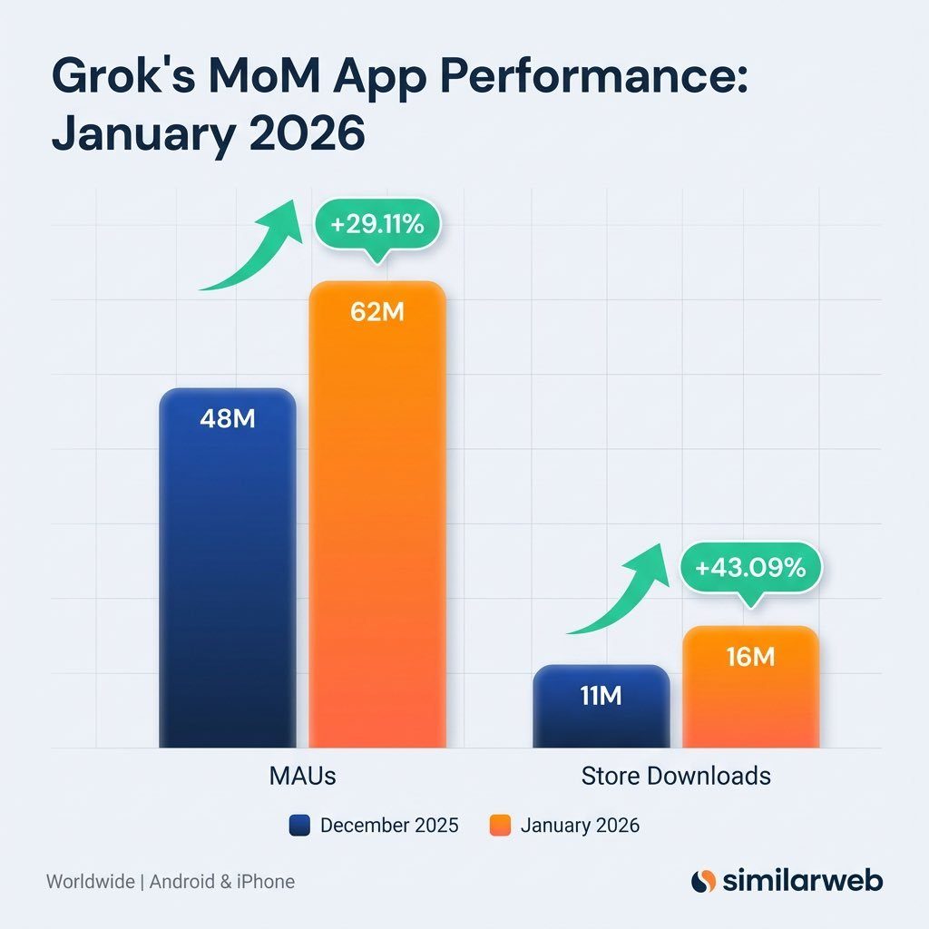 ข้อมูลดังกล่าวถูกเปิดเผยผ่านโพสต์บน X โดยอ้างอิงสถิติจาก Similarweb ซึ่งระบุว่า Grok มียอดดาวน์โหลดเพิ่มขึ้นถึง 43% แบบเดือนต่อเดือน (Month-over-Month) ขณะที่จำนวนผู้ใช้งานต่อเดือน หรือ Monthly Active Users (MAU) เติบโตเกือบ 30% ภายในระยะเวลาเพียงหนึ่งเดือน