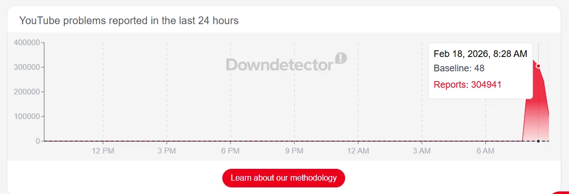 เกิดเหตุขัดข้องครั้งใหญ่กับแพลตฟอร์มวิดีโอชื่อดัง YouTube ในช่วงเช้าวันที่ 18 กุมภาพันธ์ 2026 ส่งผลให้ผู้ใช้งานจำนวนมากไม่สามารถเข้าใช้งานเว็บไซต์และแอปพลิเคชันได้ตามปกติ
