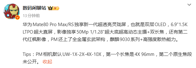 รายงานจาก 数码闲聊站 เผย Huawei เตรียมเปิดตัว Mate 80 Pro Max/RS พร้อมหน้าจอรุ่นใหม่ Linglong OLED แบบสองชั้น ขนาด 6.9 นิ้ว ความละเอียด 1.5K และเทคโนโลยี LTPO ให้ความสว่างสูง สีสันสดใส และความคมชัดขั้นสุด