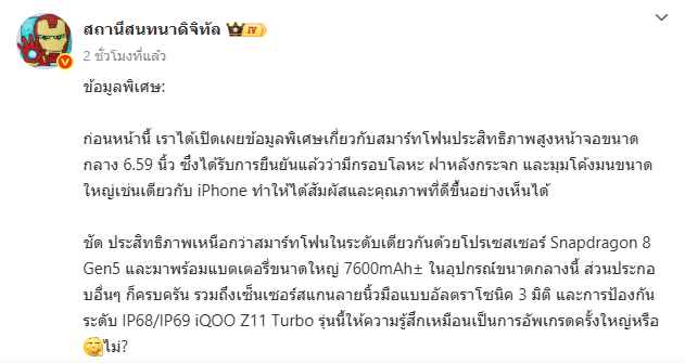 แหล่งข่าวไอทีจากจีนเผยข้อมูลล่าสุดของสมาร์ตโฟนรุ่นใหม่อย่าง iQOO Z11 Turbo ซึ่งถูกวางตำแหน่งเป็นสมาร์ตโฟนสายแรงที่อัปเกรดสเปกครั้งใหญ่ ทั้งด้านประสิทธิภาพ แบตเตอรี่ และโครงสร้างตัวเครื่อง โดยข้อมูลดังกล่าวถูกเปิดเผยผ่านแพลตฟอร์ม Weibo จากบัญชีแหล่งข่าววงใน
