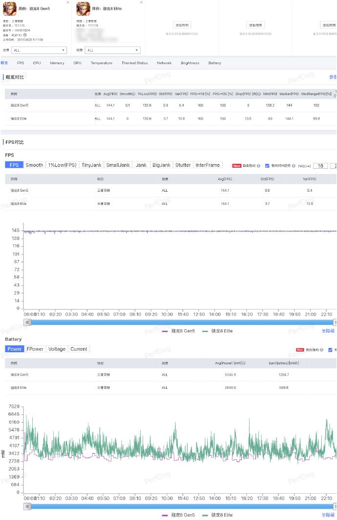 จากการทดสอบเกม Honor of Kings ในสถานการณ์โหลดต่ำถึงปานกลาง OnePlus Ace6T ซึ่งเป็นหนึ่งในสมาร์ทโฟนรุ่นแรกที่รองรับโหมดเฟรมเรตสูงสุด 144 FPS สามารถรักษาเฟรมเรตสูงสุดไว้ได้เทียบเท่ารุ่น Snapdragon 8E แต่ใช้พลังงานเฉลี่ยเพียง 3.24 วัตต์ ซึ่งต่ำกว่าคู่เทียบอย่างชัดเจน