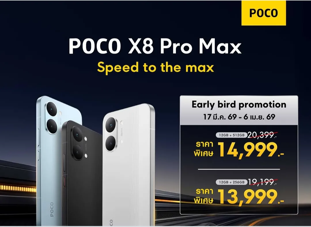 POCO ได้สร้างความตื่นเต้นในตลาดสมาร์ทโฟนอีกครั้ง ด้วยการเปิดตัวโปรโมชั่น “Early Bird Promotion” สำหรับสมาร์ทโฟนเรือธงรุ่นล่าสุด POCO X8 Pro Max ที่มาพร้อมสโลแกน “Speed to the max” โดยมอบข้อเสนอสุดพิเศษและส่วนลดมากมาย สำหรับผู้ที่สนใจเป็นเจ้าของก่อนใคร ในช่วงระหว่างวันที่ 17 มีนาคม ถึง 6 เมษายน 2569 นี้