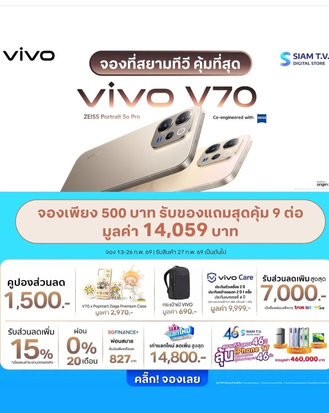 ลูกค้าที่จอง vivo V70 ผ่าน Siam TV จะได้รับสิทธิประโยชน์ ได้แก่