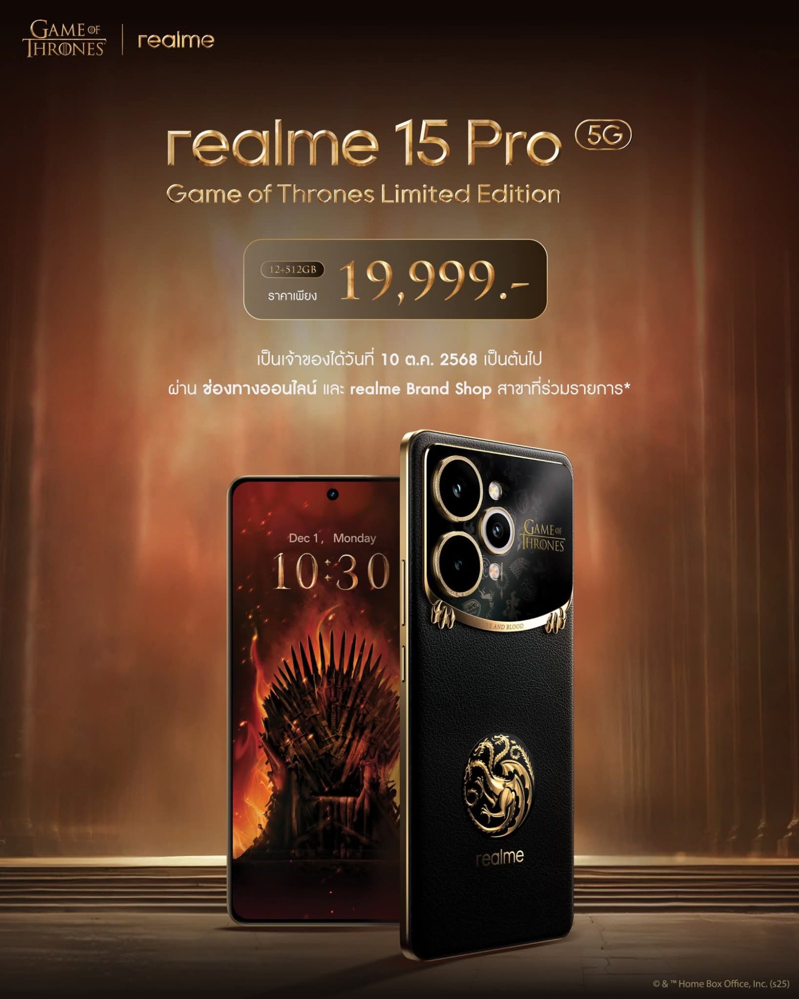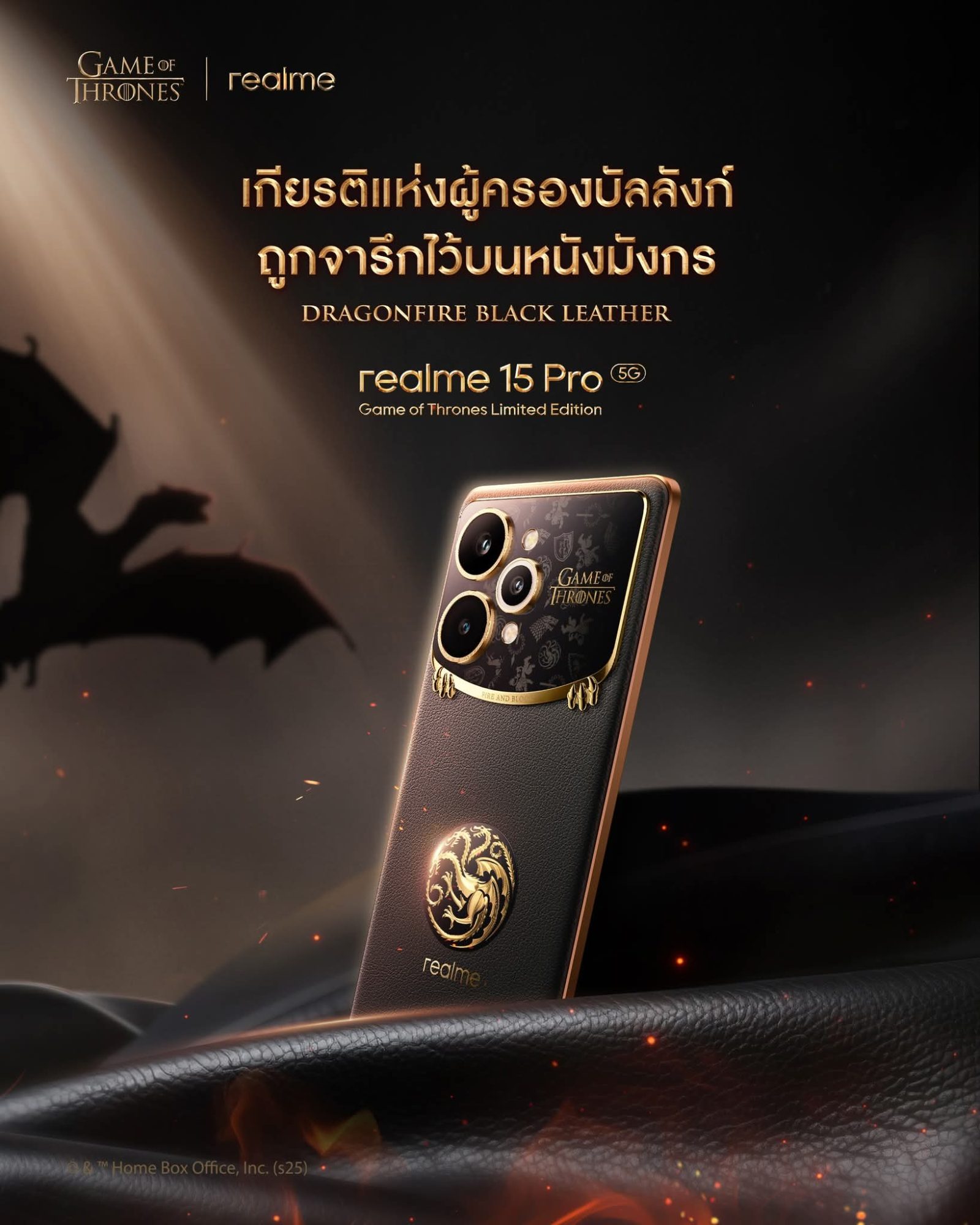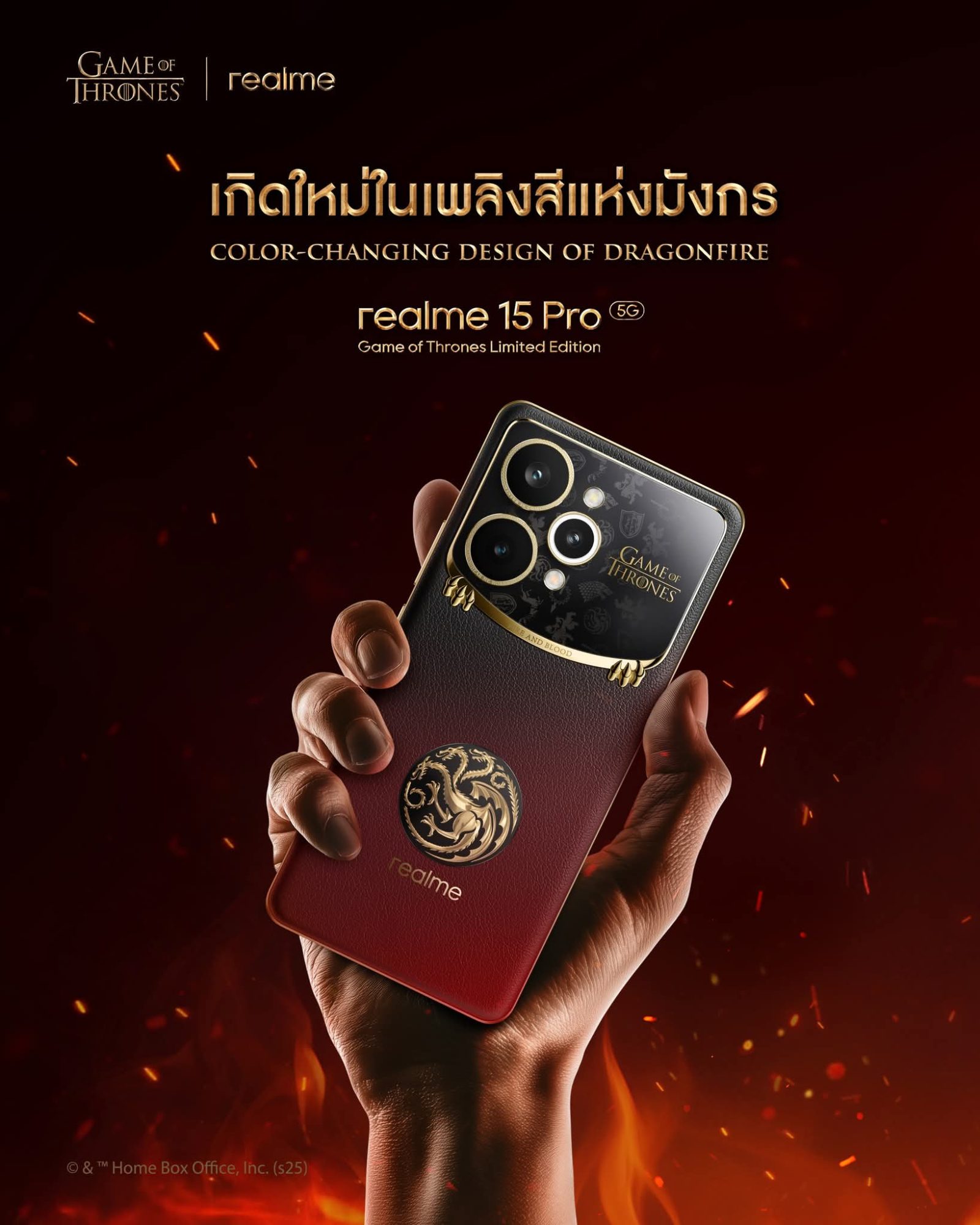 realme เปิดศักราชใหม่ให้กับแฟนสมาร์ตโฟนและซีรีส์ระดับตำนาน ด้วยการเปิดตัว realme 15 Pro 5G Game of Thrones Limited Edition รุ่นพิเศษที่ได้รับแรงบันดาลใจจากจักรวาลแห่ง Westeros ซึ่งถือเป็นครั้งแรกของโลกที่แบรนด์สมาร์ตโฟนจับมือกับซีรีส์ Game of Thrones เพื่อนำเสนออัตลักษณ์แห่ง "พลัง" ในดีไซน์และประสิทธิภาพระดับพรีเมียม