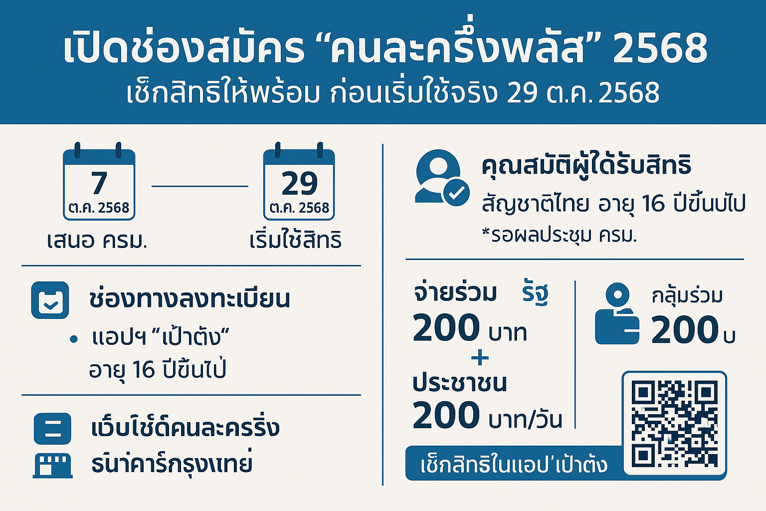 รัฐบาลภายใต้การนำของนายอนุทิน ชาญวีรกูล เตรียมเดินหน้าโครงการ “คนละครึ่งพลัส” เพื่อพยุงกำลังซื้อและกระตุ้นเศรษฐกิจ โดยกระทรวงการคลังมีกำหนดเสนอเข้าที่ประชุม ครม. วันที่ 7 ตุลาคม 2568 หากผ่านความเห็นชอบ จะเปิดทางให้ประชาชนเริ่มใช้สิทธิได้ตั้งแต่ 29 ตุลาคม 2568