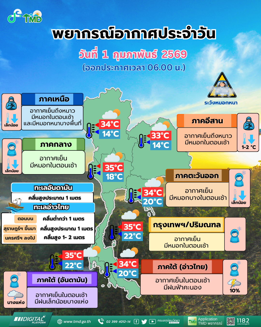 ขณะที่ภาคอื่น ๆ ของประเทศยังคงมีอากาศเย็นถึงหนาวในช่วงเช้า พร้อมกับมีหมอกและหมอกหนาในบางพื้นที่ โดยอุณหภูมิโดยรวมจะลดลงเล็กน้อย กรมอุตุนิยมวิทยาแนะนำให้ประชาชนดูแลรักษาสุขภาพจากสภาพอากาศที่เปลี่ยนแปลง และเพิ่มความระมัดระวังในการเดินทาง โดยเฉพาะบริเวณที่มีหมอกซึ่งอาจส่งผลต่อทัศนวิสัย